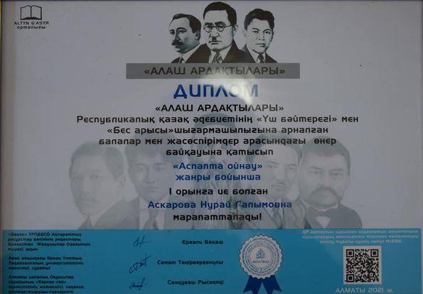 "Алаш Ардақтылары" Республикалық қазақ әдебиетінің "Үш бәйтерегі" мен "Бес Арысы " шығармашылығына арналған балалар мен жасөспірімдер арасындағы өнер байқауына 6 сынып оқушысы Аскарова Нурай Ғалымқызы қатысып, "Аспапта ойнау" жанры бойынша I орынды жеңіп алды. Ән -күй пәнінің мұғалімі Ерсінбек Жасұлан "Үздік жетекші" номинациясына ие болды. Жеңістеріңіз құтты болсын!