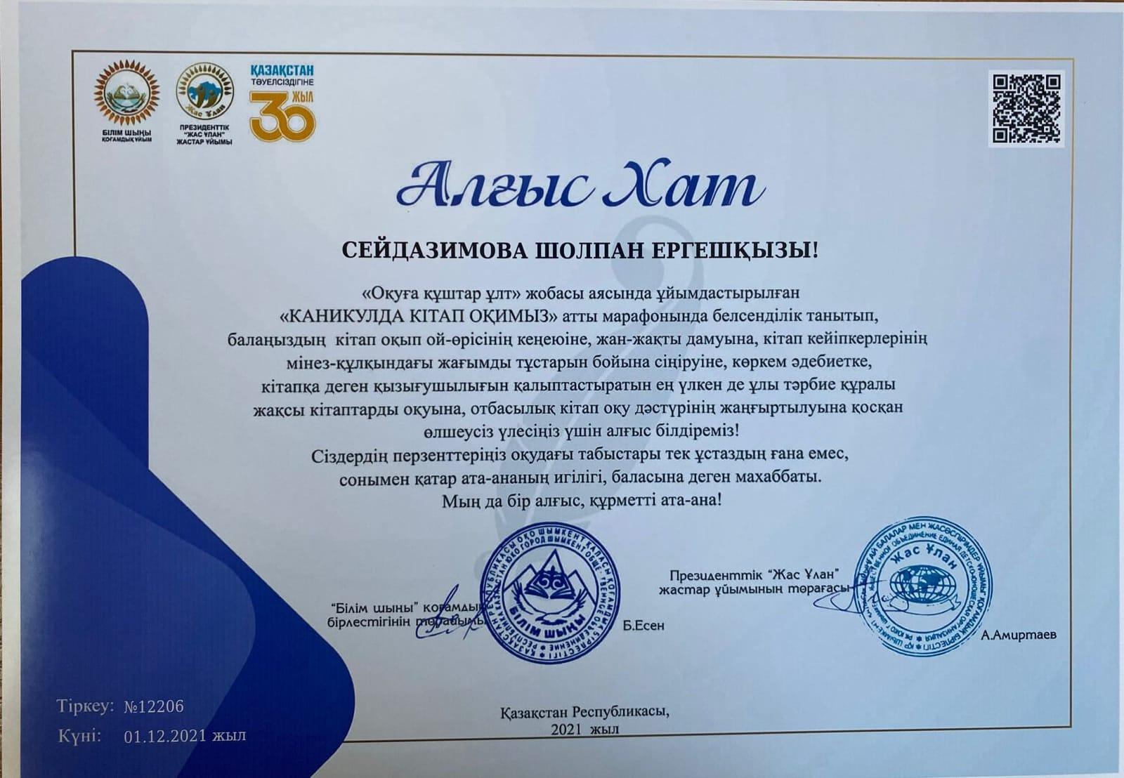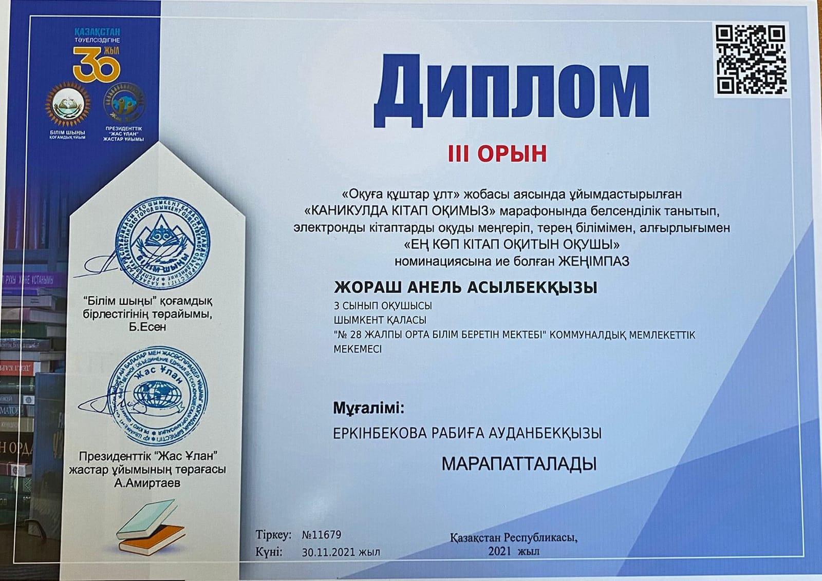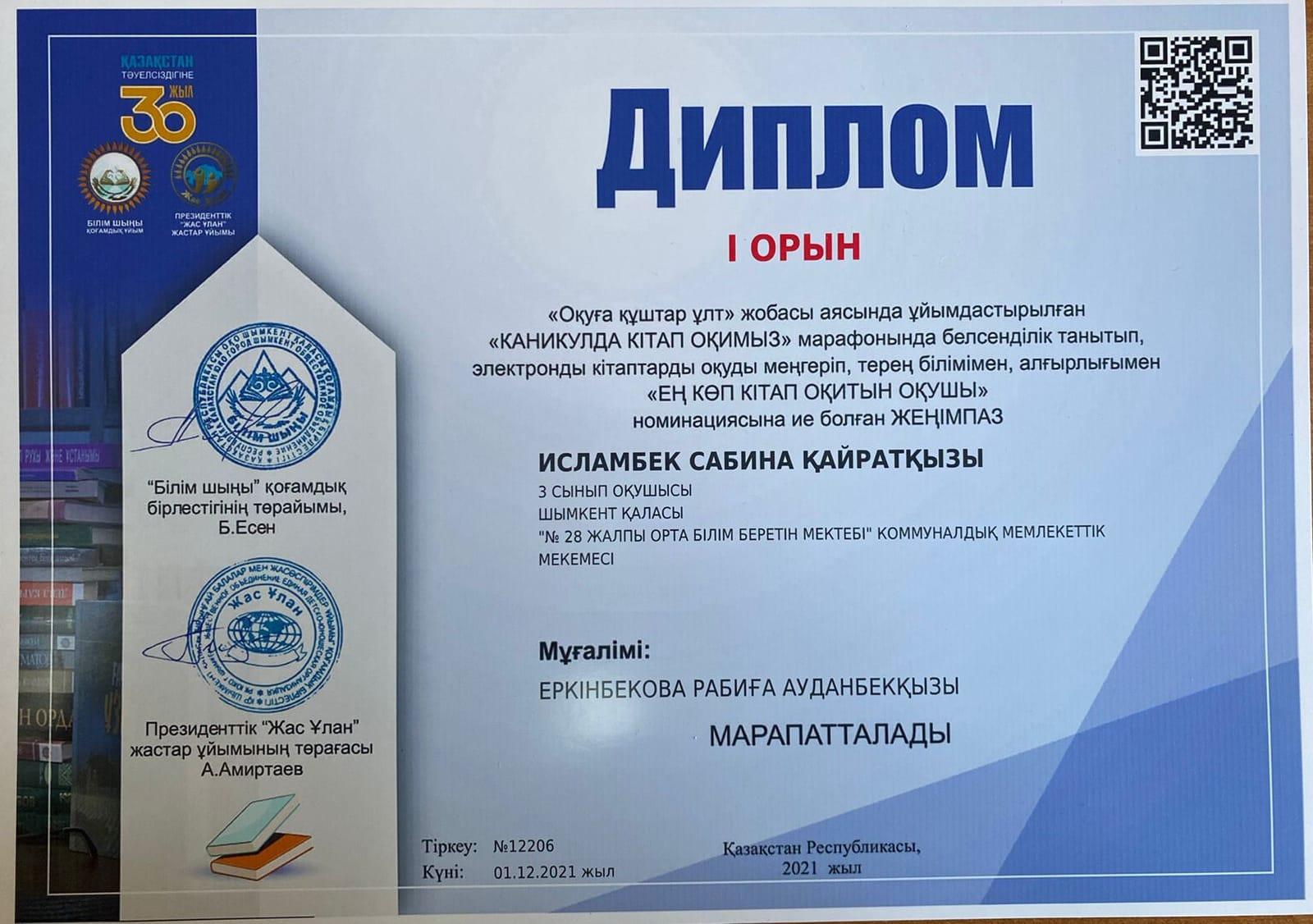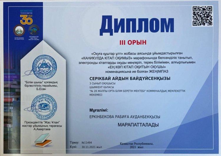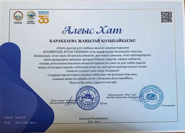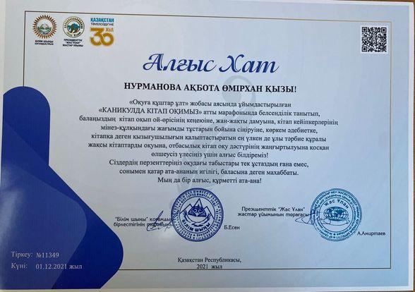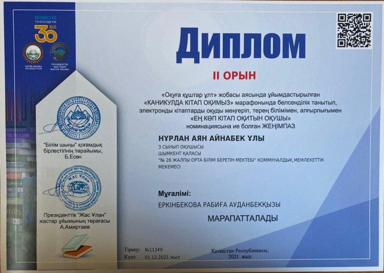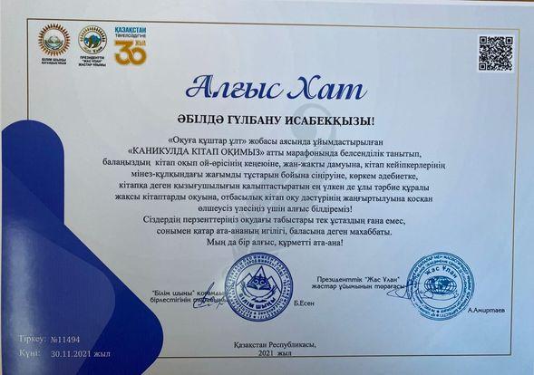 Президенттік ,,Жас Ұлан" жастар ұйымы және ,, Білім шыңы,, бірлестігінің "Оқуға құштар ұлт,, жобасы аясында ұйымдастырылған "КАНИКУЛДА КІТАП ОҚИМЫЗ,, марафонында белсенділік танытып, электронды кітаптарды оқуды меңгеріп, терең білімімен, алғырлығымен ,,Ең кітап оқитын оқушы,, номинациясының жеңімпаздары 3 "Ә" сынып оқушылары