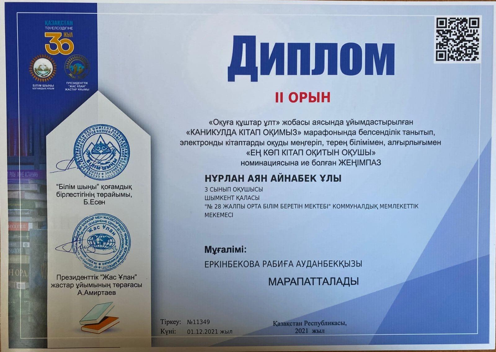 ІІ орын Нұрлан Аян Айнабекұлы