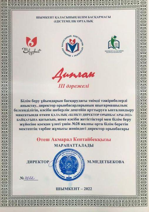 Қалалық директор орынбасарлары арасында өткізілген “БІЛІКТІ ДИРЕКТОР ОРЫНБАСАРЫ-2022” байқауынан № 28 жалпы орта білім беретін мектебінің директордың тәрбие ісі жөніндегі орынбасары Өтеш Ақмарал Кентайбекқызы ІІІ дәрежелі Дипломмен марапатталды. Марапатыңыз құтты болсын. Тәжірибелі шеберлігіңіз шыңдала берсін!