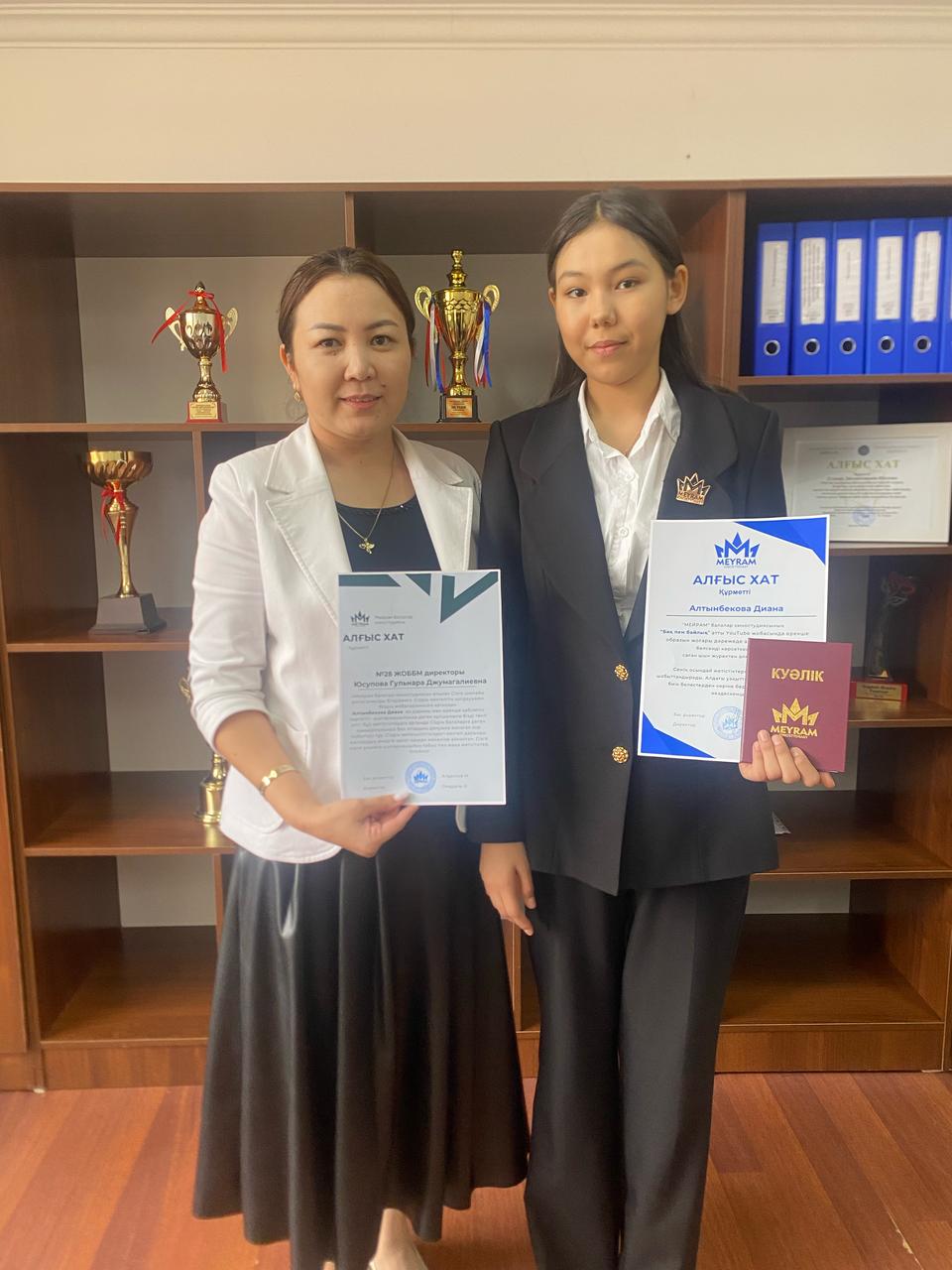 Бас директор: Ағадилов М. деген марапаттауымен жазылған Алғыс хатты N28 жалпы орта білім беретін мектебінің оқушысы Алтынбекова Диана дарыны мен ерекше қабілеттірін көрсетіп, киноиндустрия саласында өз бағын сынады.