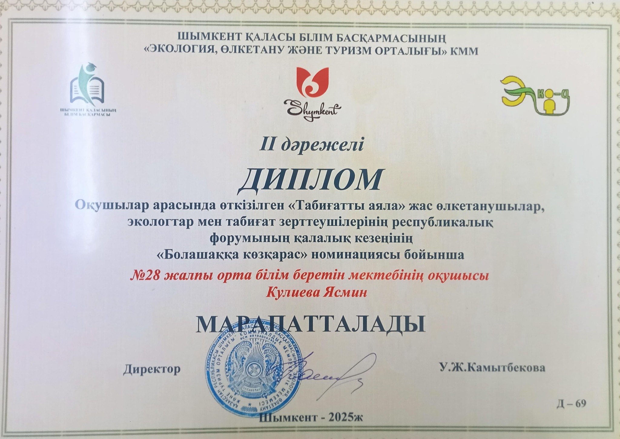 17 апреля 2025 года в городе Шымкенте проходил экологический конкурс «Табиғатты аяла» («Оберегай природу»), в номинации «Болашақка көзқарас»(«Взгляд в будущее»). Ученица 9 «Г» класса ОСШ №28 Кулиева Ясмин заняла II место, награждена дипломом II степени и ценным подарком – скейтборт.